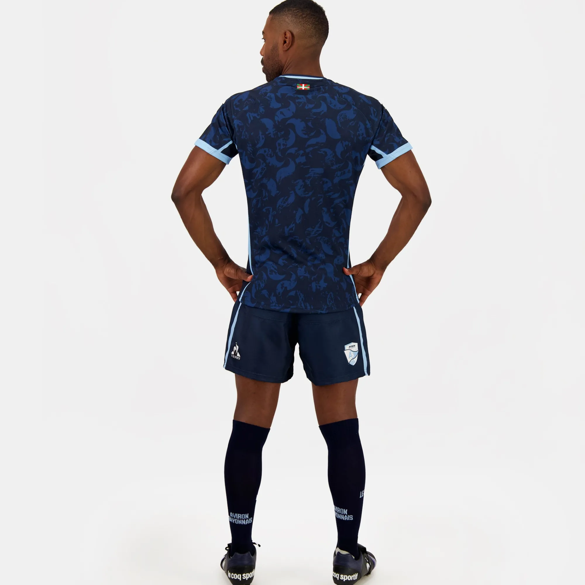 – Logotipo de Aviron Bayonnais en la pierna derecha en la espalda en sublimación