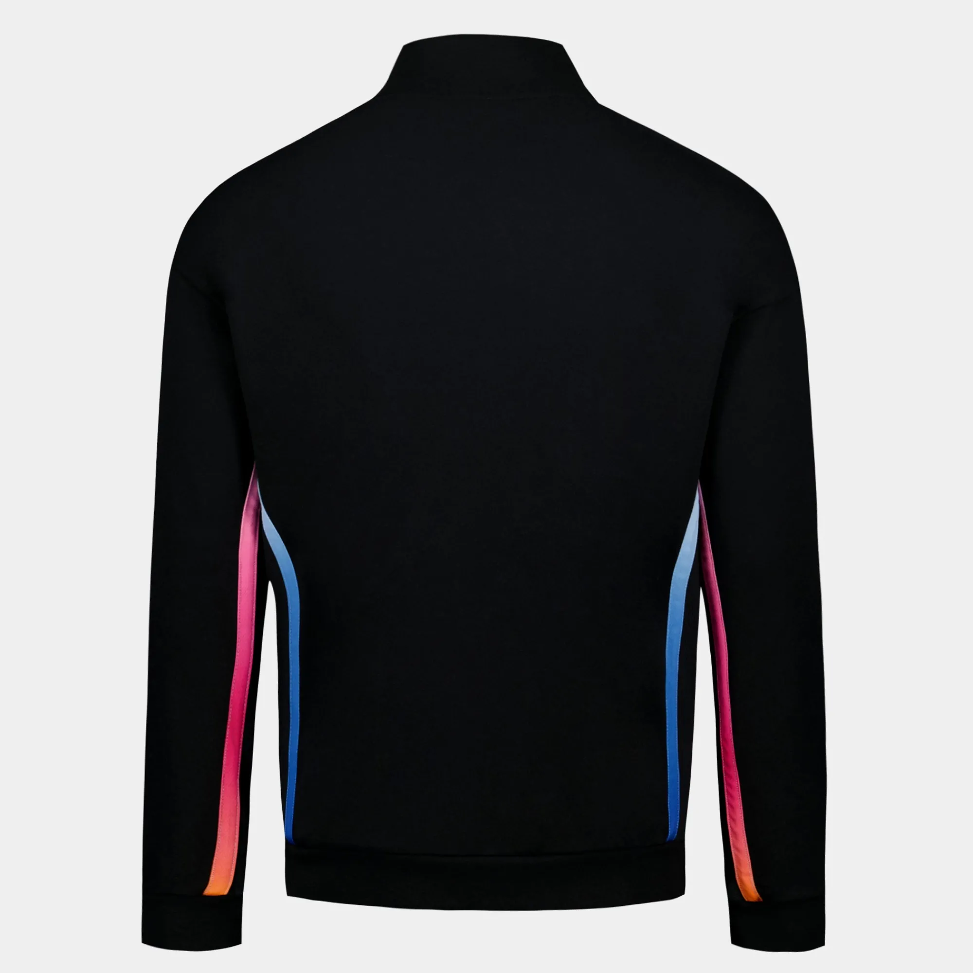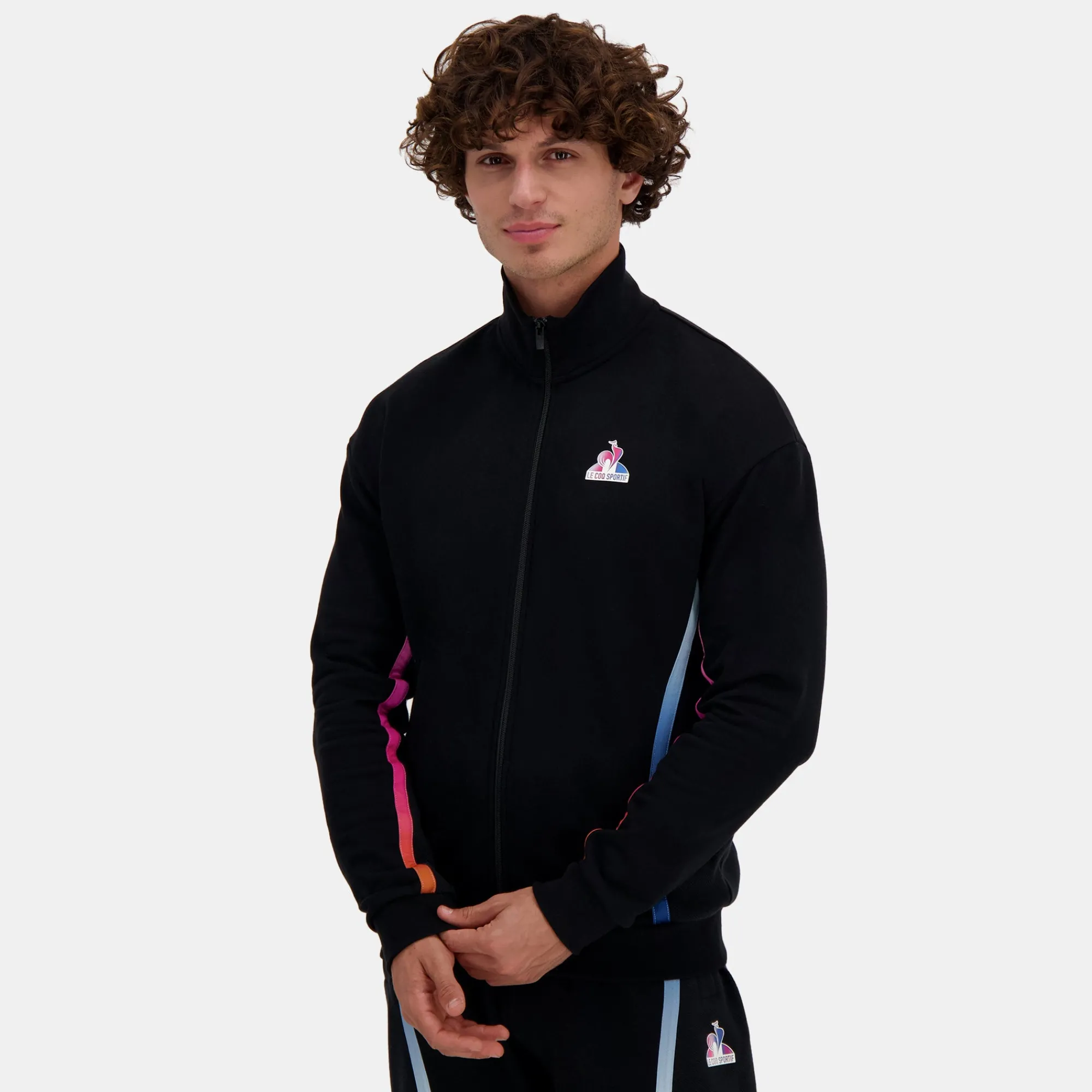 – Corte holgado/ancho – Abertura central delantera con cremallera, canesúes laterales y debajo de las mangas en elegante material acanalado, bandas de poliéster degradadas sublimadas aplicadas en la parte delantera, la espalda y las mangas, bolsillos ribeteados con cremallera en la parte delantera – Canalé 1×1 en la parte inferior de las mangas, la parte inferior del cuerpo y el cuello – logotipo «LE COQ SPORTIF» de silicona con efecto lenticular que revela los tres colores fuertes de la bandera francesa aplicados en el lado izquierdo del pecho desgastado