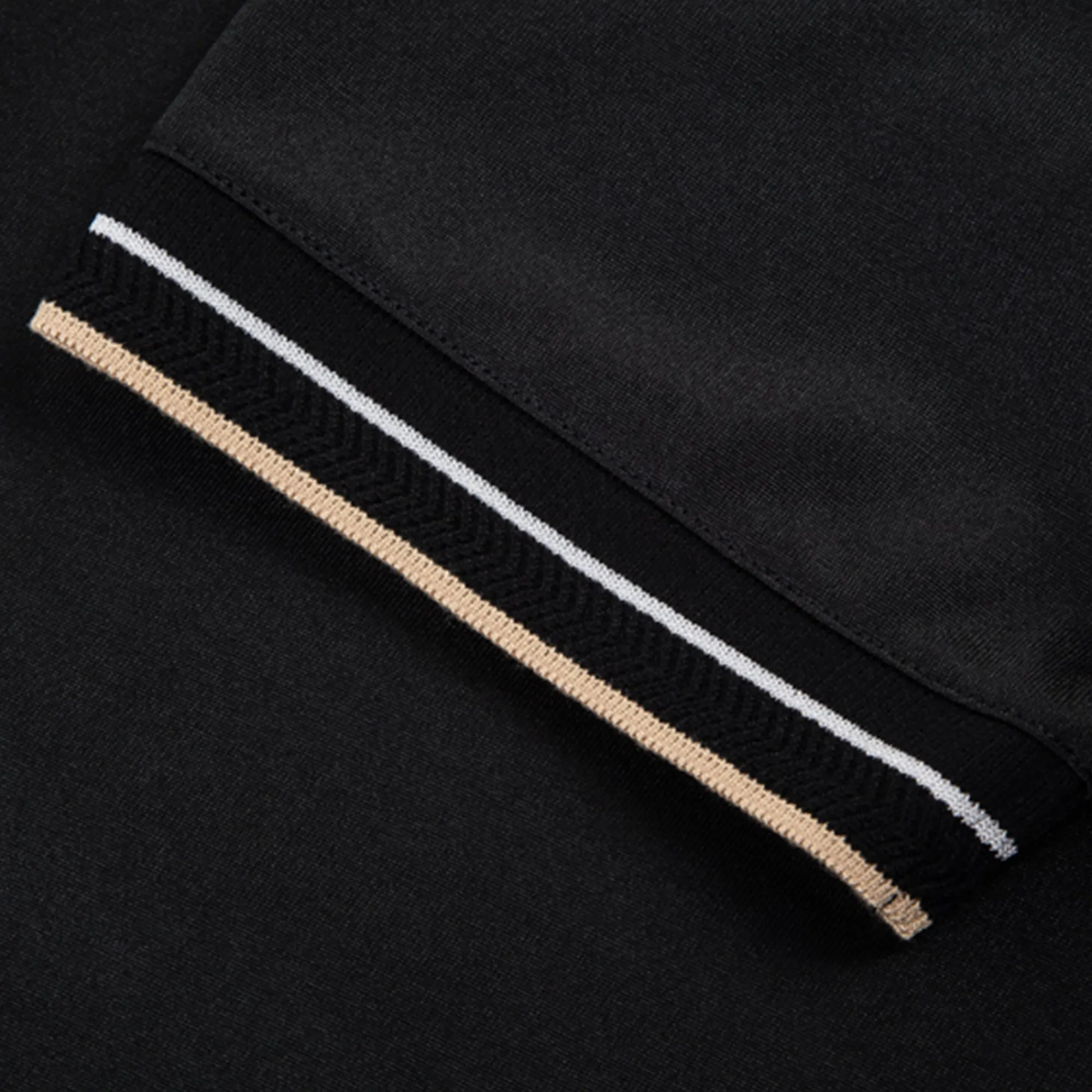 – Cuello y puños de canalé 1×1 en banda rectilínea de chevron tricolor