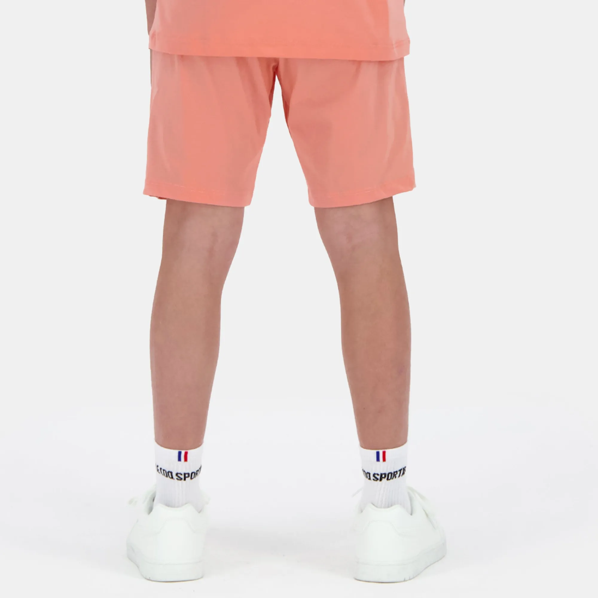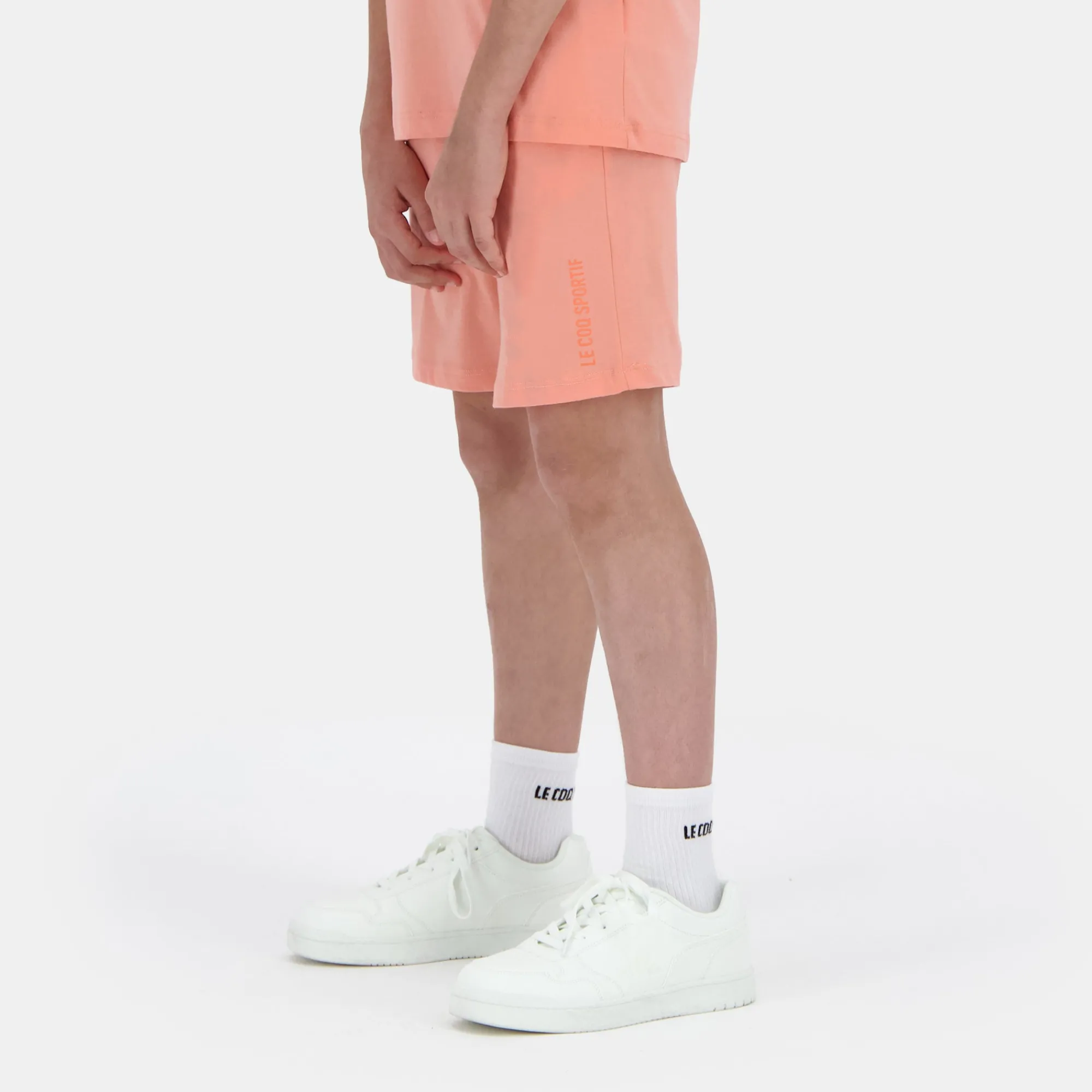 – Escritura serigrafiada “Le Coq Sportif” en tono coral/offset en la parte inferior de la pierna izquierda cuando se usa